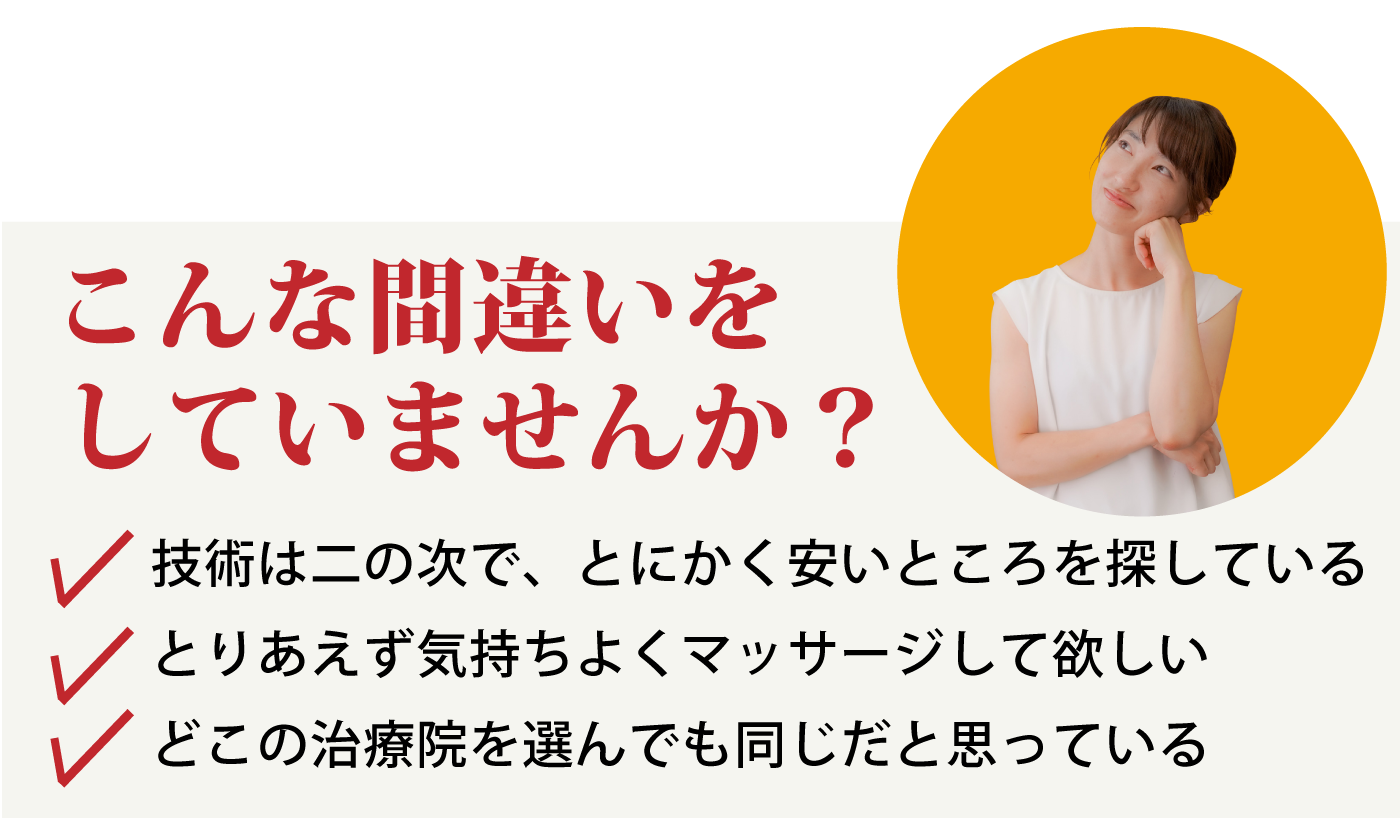 あなたが整形外科や整骨院・他の整体院などに行って良くならないのには理由があります。 それは本当の原因にアプローチができていないからです。