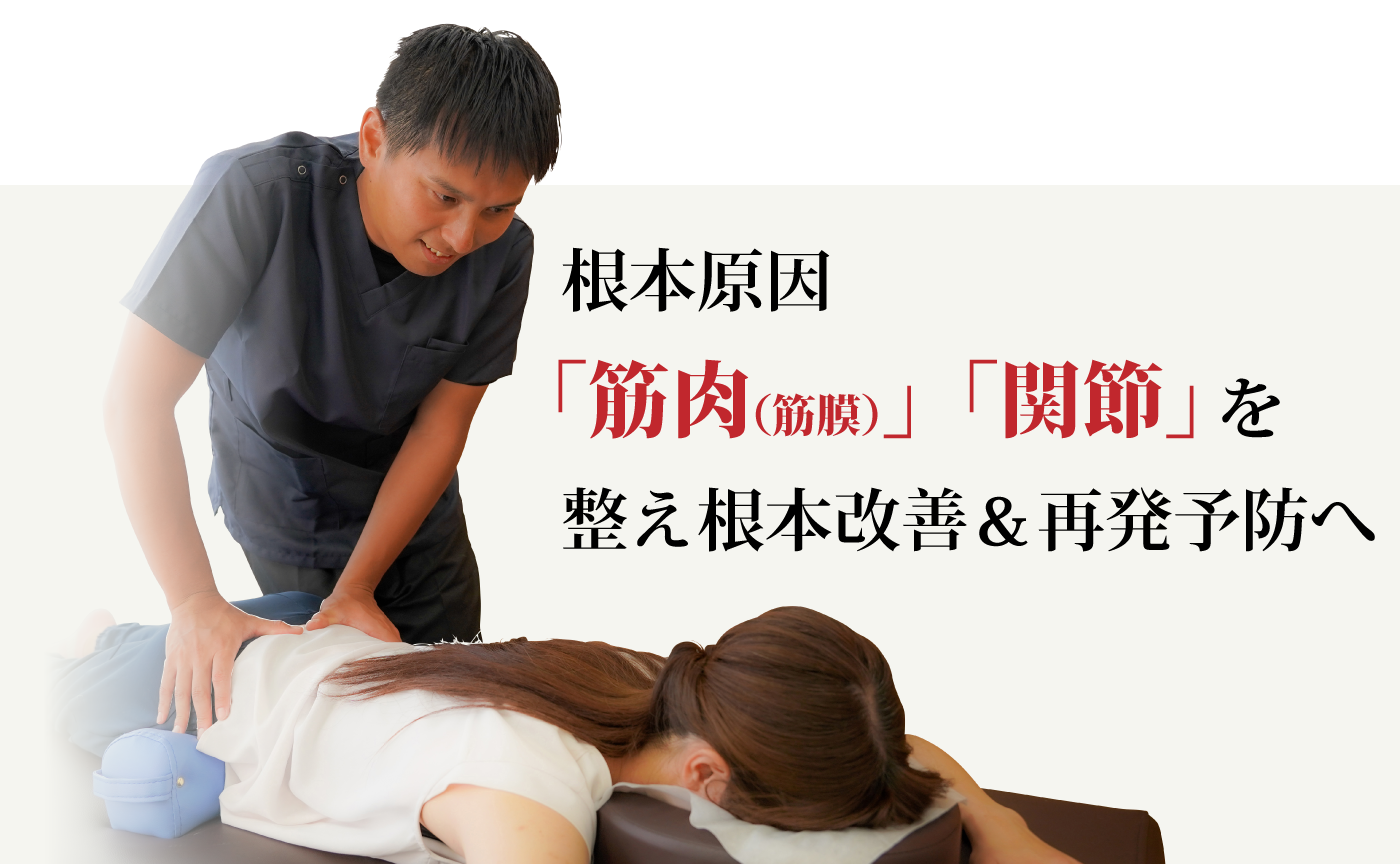 使えていない筋肉・関節を探し、正しく働かせないとまた痛みは再発してしまいます。 痛みの本当の原因を特定し、施術することが根本改善への近道となります。